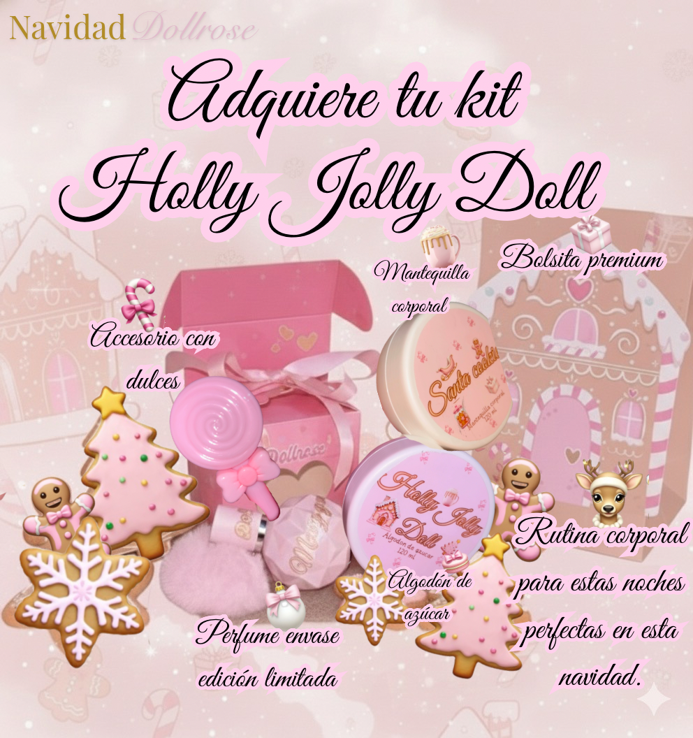 El Kit Navideño de Dollrose “Holly Jolly Doll” es una edición especial creada para envolverte en la magia, el aroma y la calidez de la temporada. Está compuesto por tres productos únicos, cada uno con una fragancia diferente dentro del universo dulce de Dollrose, pero conectados por una misma esencia: la Navidad más deliciosa, cozy y auténtica.